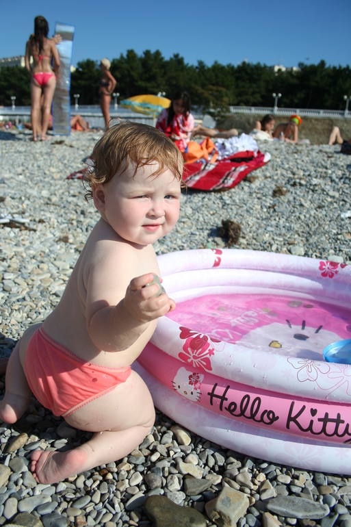 Вообще-то, Камилла просто обожает море, еще малышкой, не умея ходить, она шустро выползала из бассейна, и быстро-быстро, пока не поймали, ползла к морю. Больше всего ей нравилось бросать в него камушки. На фото ниже Пухле чуть больше года.