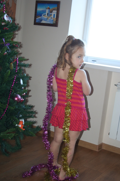 ....игры с елочной мишурой! Чем они только не были, на этом фото, например, королевский шлейф :-)