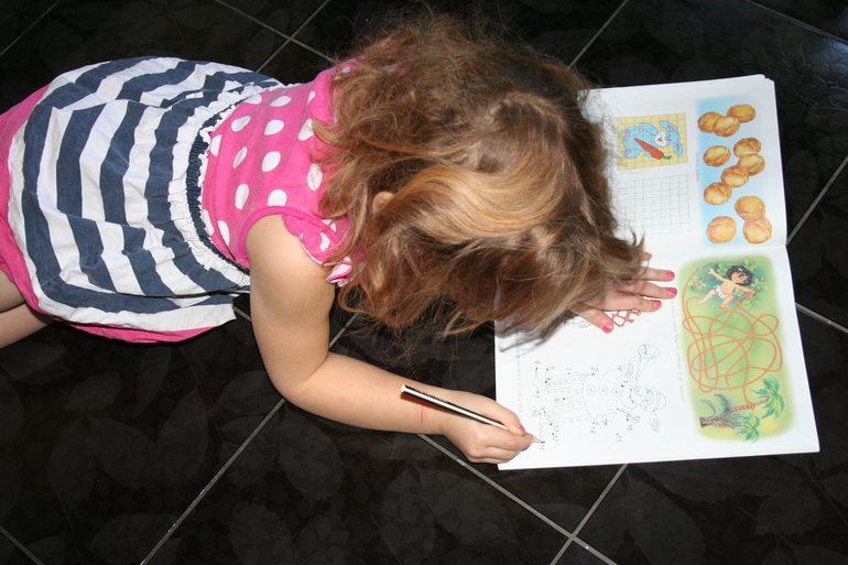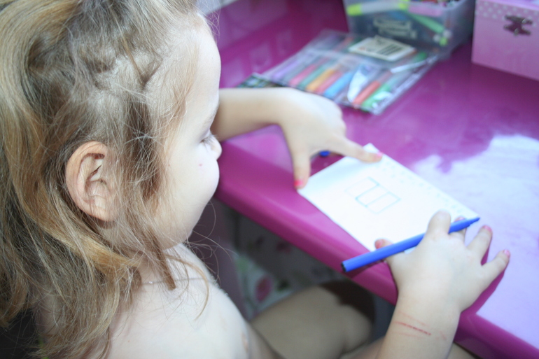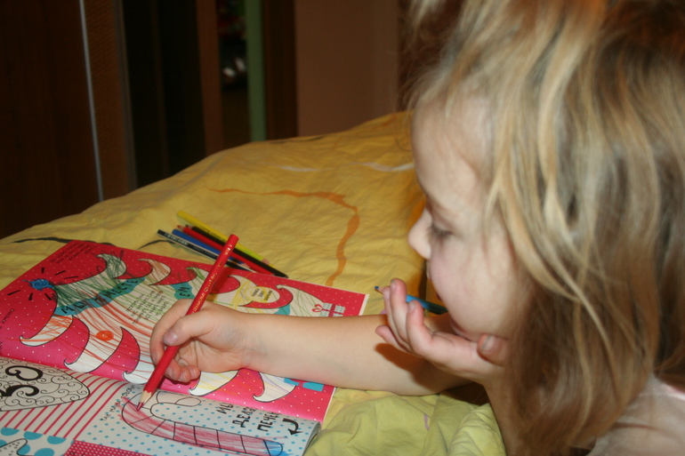 Кроме открыток, над которыми мы по чуть-чуть трудимся каждый день, и несложных заданий из стаканчиков, в основном на раскрашивание, творим мы и в рабочих тетрадях, почему-то последнее время это занятие невероятно увлекло Камика.