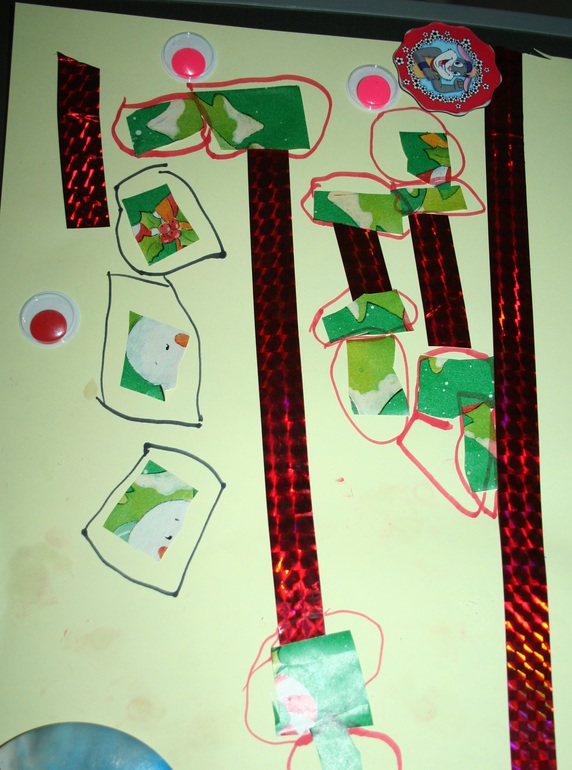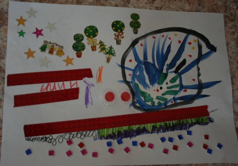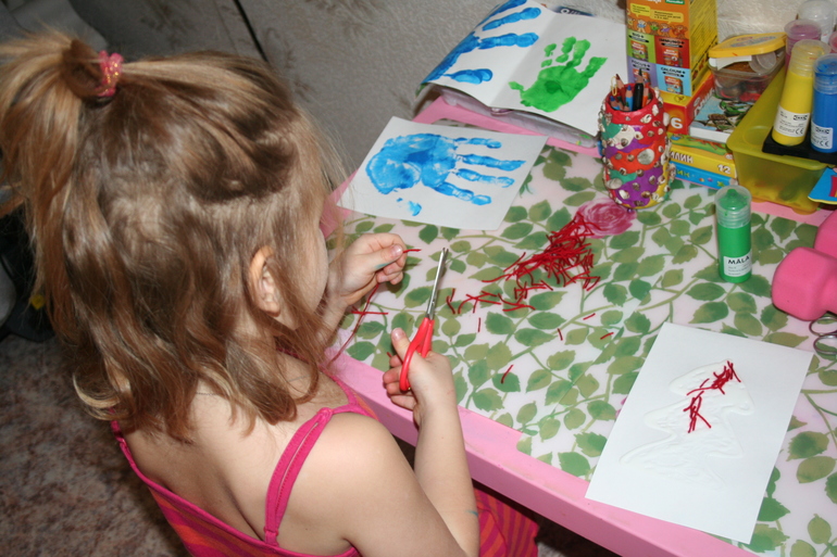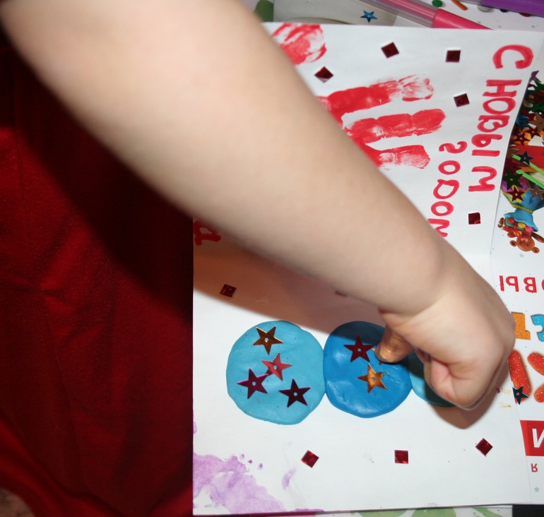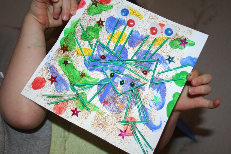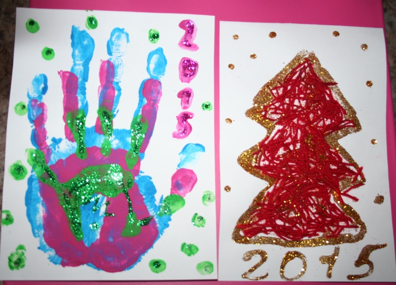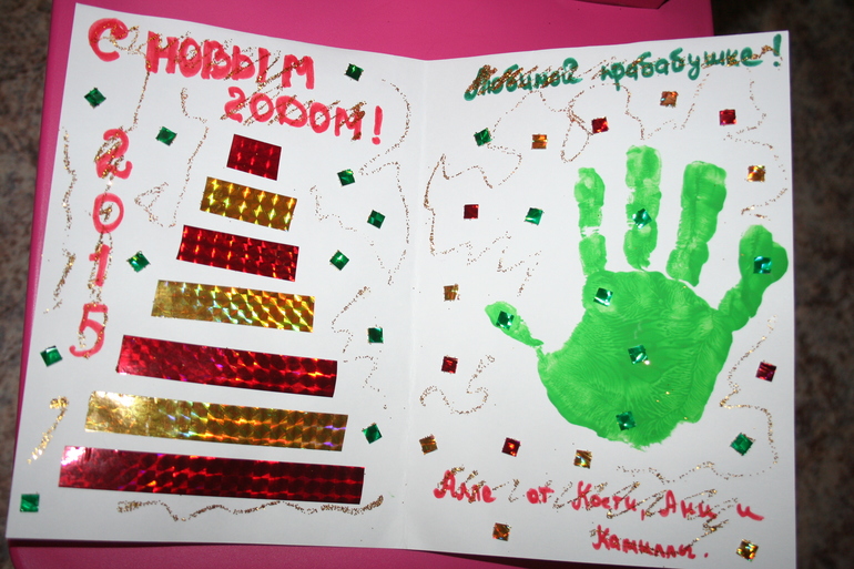К ладоням все наше семейство руку приложило, а вот елочку делала в основном я, Камилка только детали поставляла :-)