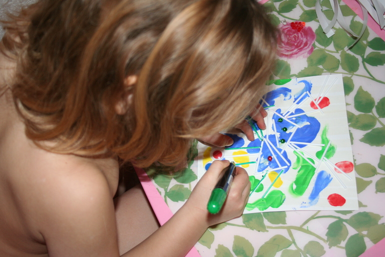 Очень я люблю Камилкины самостоятельные работы, вот это как раз они. Сотворила она эти очаровательные абстракции от и до сама. Можно, конечно, попытать ее вопросами, а что это, а что то... Но я не хочу, я просто наслаждаюсь и любуюсь, хотя второй рисунок делался не для меня и скоро будет подарен, но это неважно, главное, моя пупся творит и использует для этого все, что попадается под руку :-)
