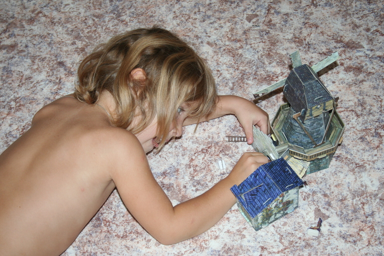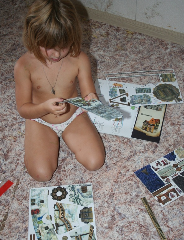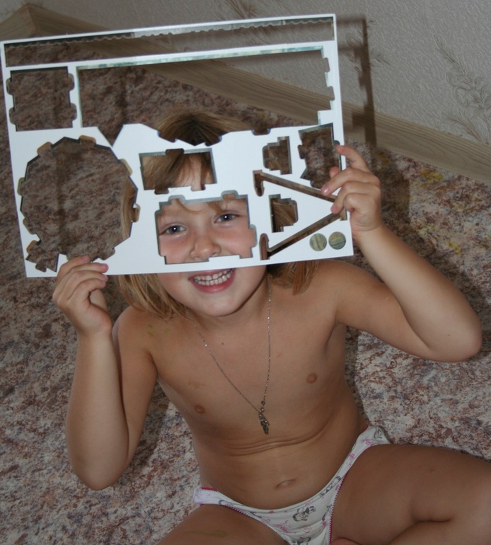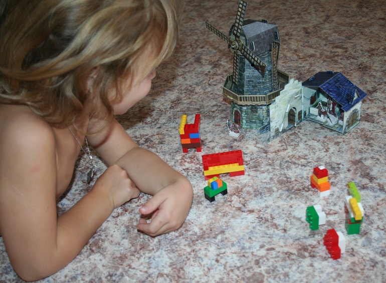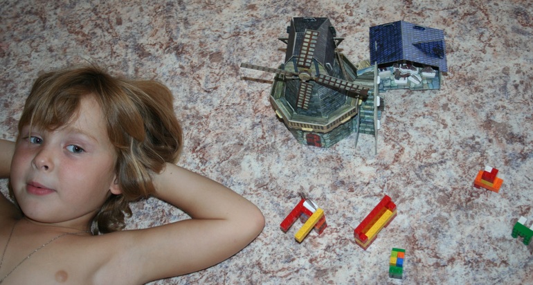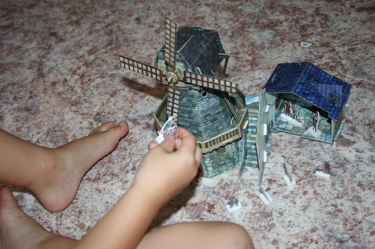 Первым нашим экспонатом стала "Мельница" (в my-shop). Собирать ее мы уселись всей семьей, и это уже большой плюс подобных развлечений. Папа был главным инженером, я подготавливала мелкие детали, а Камилла делала всю работу по извлечению строительных элементов из основы.