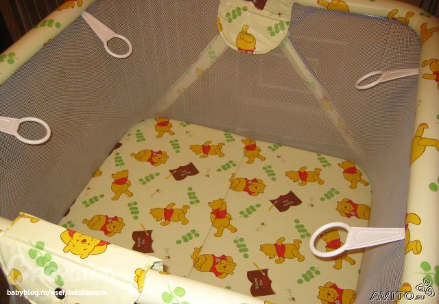 Манеж квадратной формы имеет четыре ручки-кольца для того, чтобы ребенок мог самостоятельно вставать. Манеж легко складывается, может храниться в вертикальном состоянии и занимает мало места. Металлические детали обтянуты мягким валиком, что помогает защитить малыша от ушибов. Сетка соответствует всем нормам безопасности. Покрытие манежа легко моется, а рисунки выполнены нетоксичной краской.