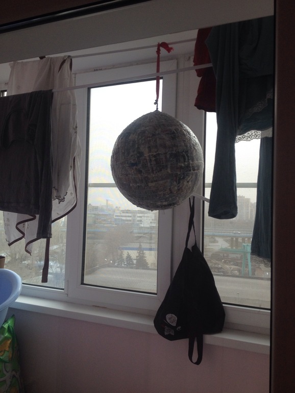 Лепила по "рецепту" из интернета, где клеем выступали мука+вода+соль. Брала большой круглый воздушный шар, на который уходило 2 часа на один слой. Всего слоев было 3 и дважды приходилось латАть разрывы.