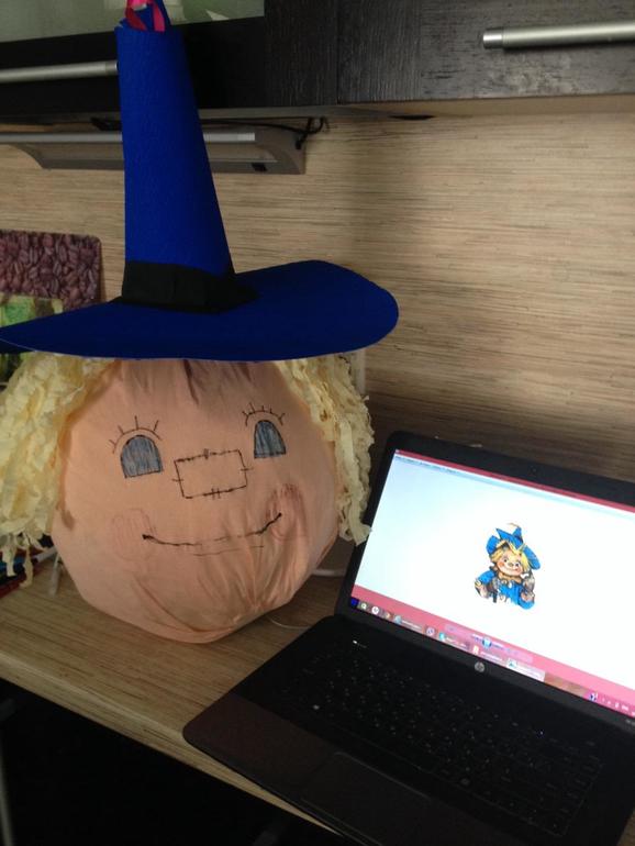 С украшением думала до последнего. Как обычно, всё приходит в последний момент. Не знала как быть с соломой, а в процессе оно само пришло в голову. Правда, шляпу пришлось мастерить из ватмана, но ничего, до сих пор "жива". Ну, старалась хоть как-то приблизить к оригиналу. Получилось?