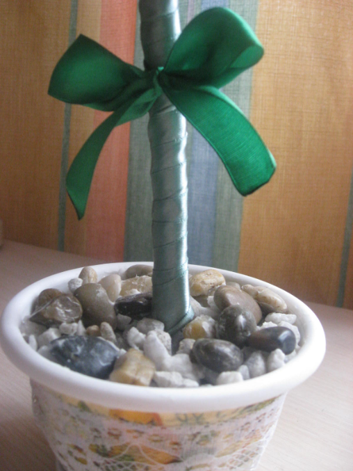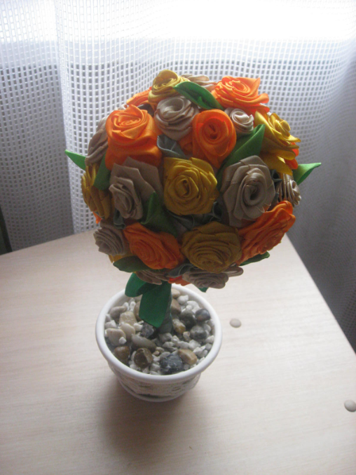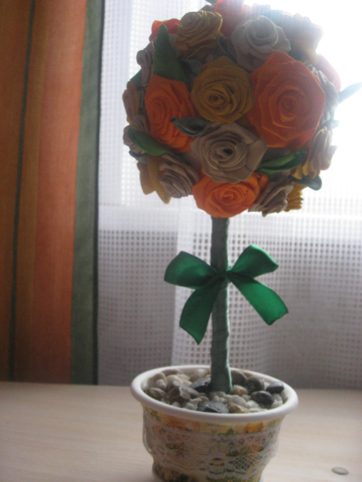 Хочу сказать, что делала я топиарий или дерево счастья первый раз. И как можно догадаться, самая большая сложность заключалась у меня в том, чтобы научиться делать розочки из лент.