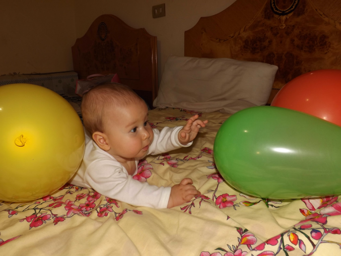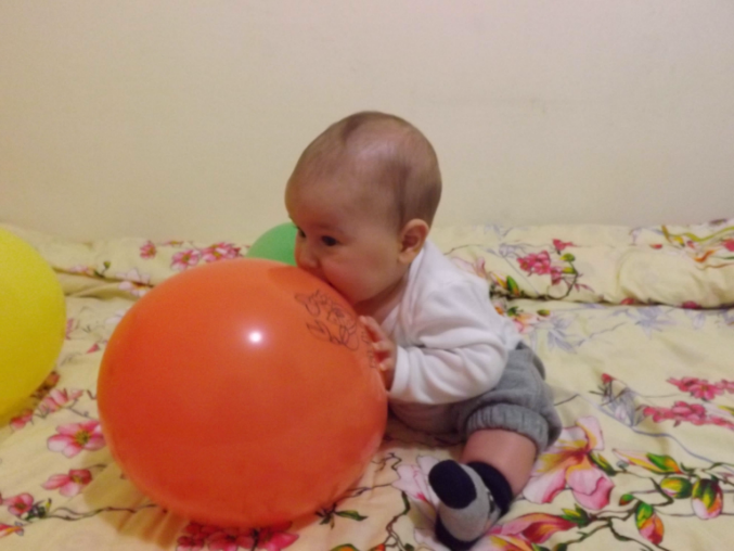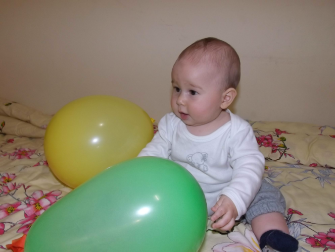 Санек , да, в восторге. Я просто уже не знала во что с ним играть, все игрушки,коврики надоели ему, нашла пачку шариков и решили надуть. Один , пока дула - лопнул, так я аж подпрыгнула, а он даже глазом не моргнул! Я конечно не даю,чьтобы сильно сжимал, так подбрасываем,катаем