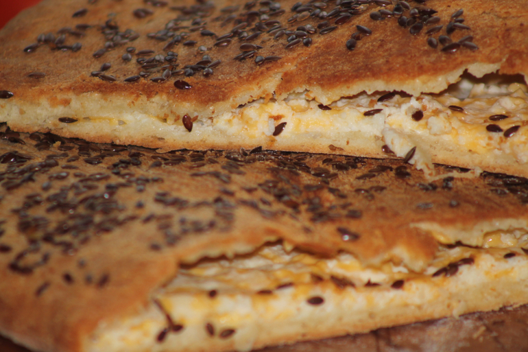 6. Смажьте лепёшки растопленным сливочным маслом я еще посыпаю кунжутом или льняными семечками. Удобней всего выпекать лепёшки на смазанном растительным маслом пергаменте для выпечки.
