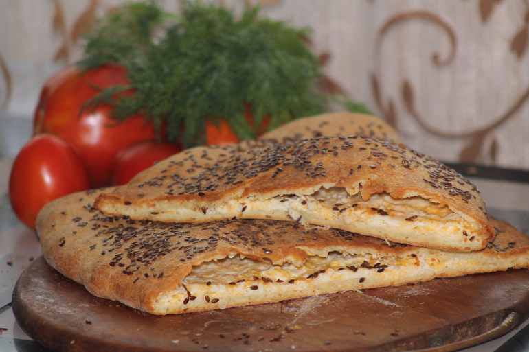 5. Разделите тесто на 4-8 частей, раскатайте их лепёшками, уложите в каждую лепёшку по ¼ начинки, оберните начинку краями и защипните. ( а можно сделать однууууууууу)
