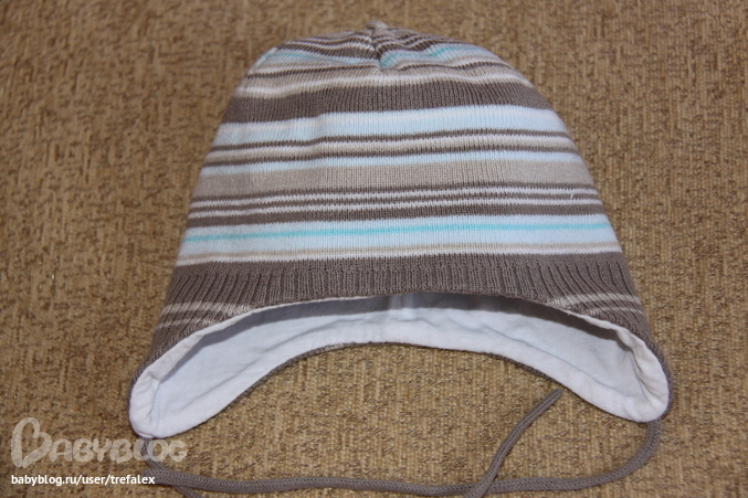 8. Осенняя вязанная шапка Broel изготовлена из двух слоев ткани.Шапочка на хлопковой подкладе, сверху вязанный трикотаж (100% хлопок), обхват головы 43/45 (6-9м) - 350 р.