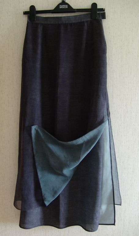 6. Юбка коллекционная «двойная», р.46=экв.700р. Талия=68 см, длина=99см, ширина низа=100см. Двойная юбка: нижняя - полиэстер, разрез=65см (от низа) и молния сбоку; верхняя юбка (длина=89см) - из шифона с боковым высоким разрезом=45см (от низа).