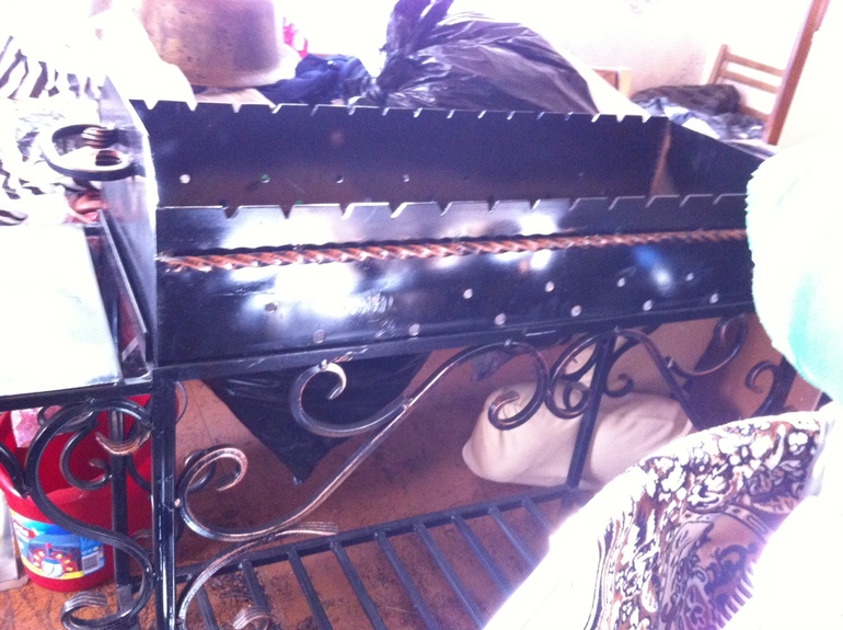 Делался на заказ из стали 4мм, витая ковка - смоленский мастер. Длина мангала=86см+35+35 (полочки по обеим сторонам) Ширина=36см, Высота до днища=72см+ 20см - глубина емкости для угля.