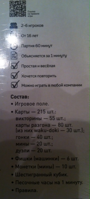Новая, в вакуумной упаковке. Эта игра разработана специально для Toyota компанией "Мосигра". Это новая для рынка механика выполнения действий с карт: игроки сражаются в вызовах (кто выше прыгнет, кто быстрее ответит на вопрос и так далее), отвечают на вопросы викторины (в данном случае, вопросы посвящены Toyota и носят обучающий характер), просто делают странные вещи. Это наиболее долгий и дорогой вариант, но он позволяет решать корпоративные задачи от обучения сотрудников ценностям компании до передачи большого объёма информации по товару. Цена=900р.