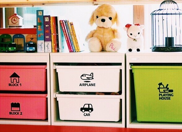 5) Наклейте на ящики для игрушек изображения с игрушками и значки стрелочки➡ Также стрелочки и изображения с салфетками можно наклеить на мусорное ведро. Незначительные изменения сделают уборку более интересной.