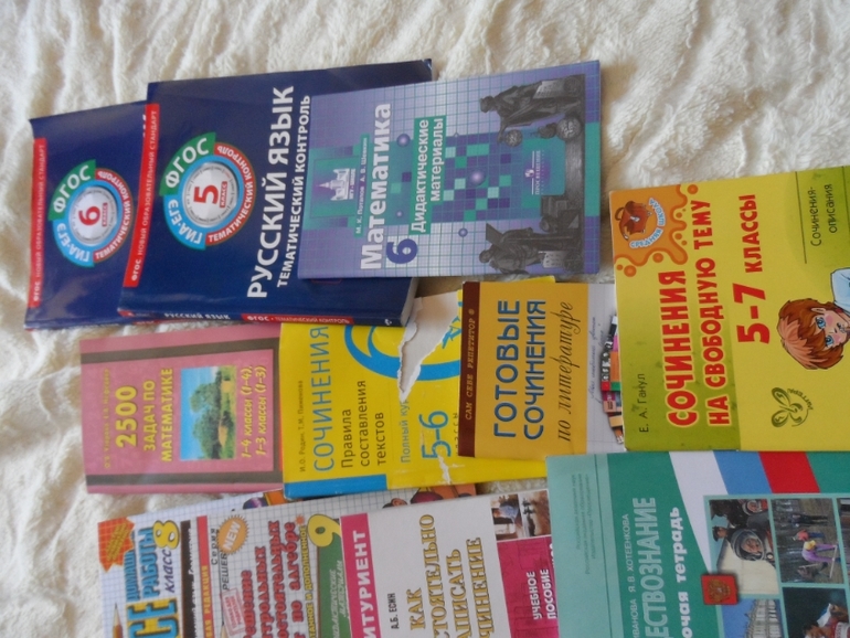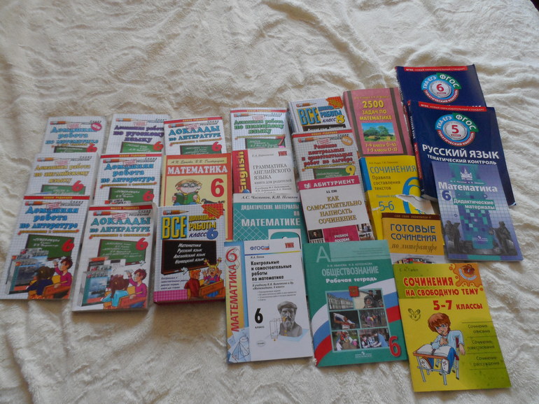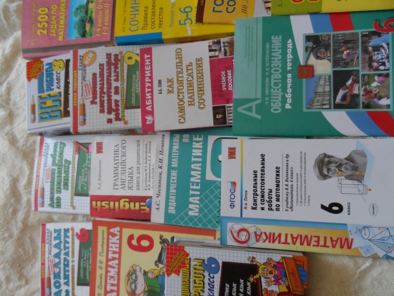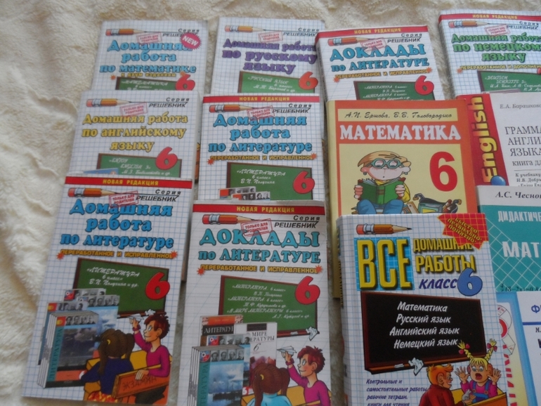 Продам пособия для школы цена от 30 до 100 рублей. Домашние работы по всем предметам за 6-й класс, учебник биологии 7-го класса новый и т.п.
