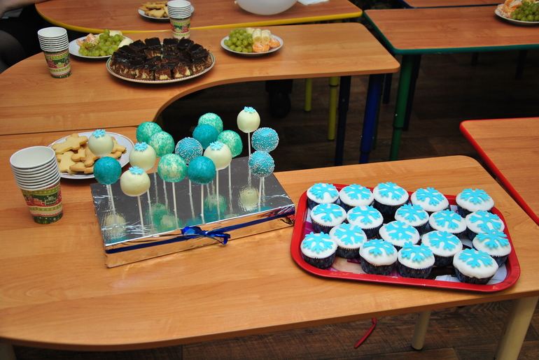 Группа у нас украшена в серебристо-синих тонах со снежинками, поэтому декор такой))