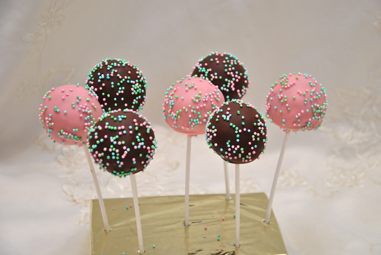 -кейкпопсы ванильные с вареной сгущенкой в темном и клубничном шоколаде,