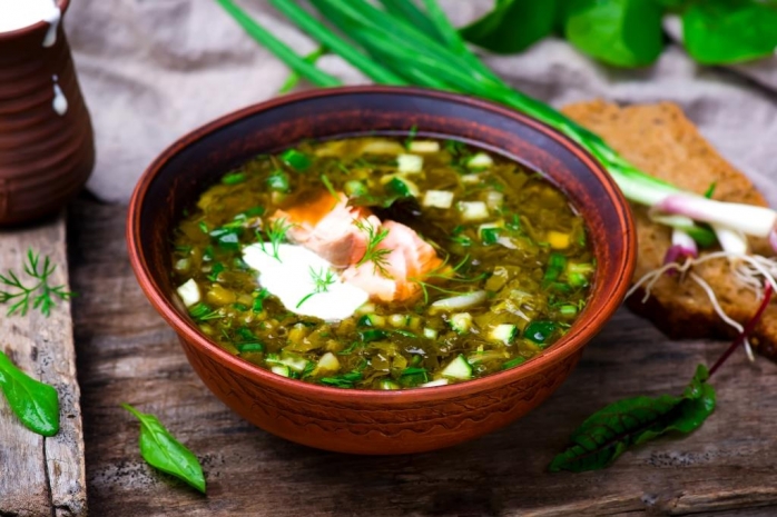 Суп в стиле ретро, таком модном сейчас. Очень легкий, без мяса, картошки и яиц, с огромным количеством разнообразной зелени, которую можно подобрать на свой вкус. Если какой-то, из указанной в рецепте, зелени вы не смогли купить, просто увеличьте количество другой. Готовится классическая ботвинья с отварной рыбой, судаком, осетриной, семгой или форелью, или с несколькими видами рыбы, главное, чтобы рыба была с небольшим количеством костей и вкусная сама по себе. Так же можно облагородить вкус этого супа раковыми шейками, выйдет совсем уже ресторанный вариант. По поводу кваса. Если вы делаете домашний квас, отлично, только не берите для ботвиньи слишком сладкий, лучше покислее. Я использовала березовый белый квас, из березового сока, и темный хлебный, получилось хорошо.Ингредиенты: