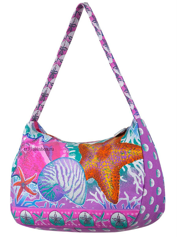Объёмная летняя сумка с двумя широкими присборенными ручками на петлях-шнурах. Застёжка-молния украшена подвеской-раковиной. Важное дополнение модели - удобный внутренний карман, закрывающийся на молнию.
