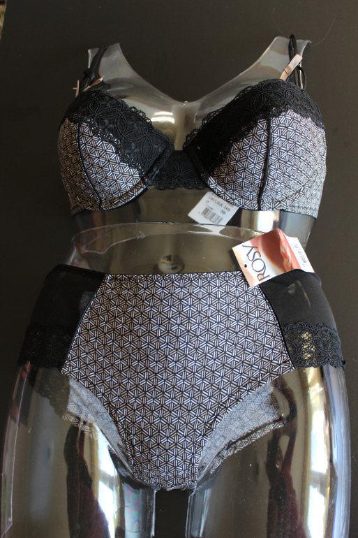 4. Rosy.Бюстгальтер размер 90В. Трусы размер L. Кокетливый и игривый бюстгальтер французской торговой марки Rosy за счет косточки и шовной чашки обладает оптимальной поддерживающей способностью. Вместе с тем, эта, очень женственная модель привлекает своим интересным дизайном. Ее тюлевая ткань элегантно присобрана в верхней части чашки, вся наружная поверхность ткани усыпана небольшими, овальными кусочками материи, выполняющими декоративную функцию. Они придают ткани рельефность и прекрасно вписываются в общий дизайн.