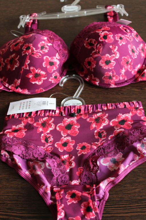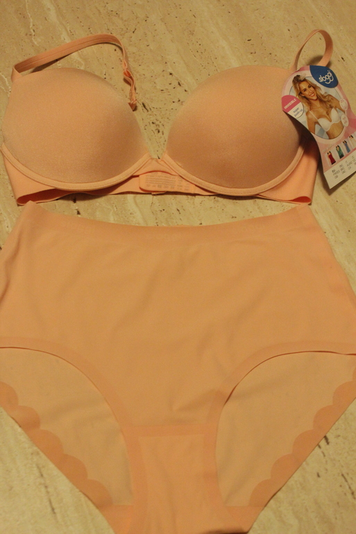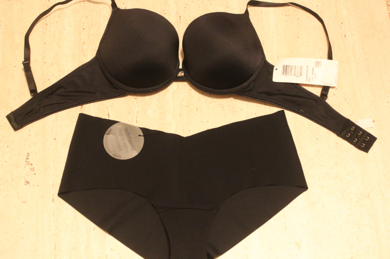 2. BeeDees. Пуш-ап бюстгальтер размер 80А с многофункциональными бретелями (можно носить бретели в различных положениях: классически, через шею и крест-накрест). Трусы размер EU 38 (наш 44). Цена 1300 рублей.