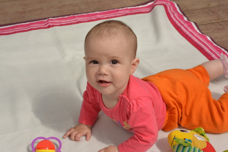 я ж с собой не совладаю! ... В общем, начинает ползти, пытается скоординировать руки и ноги и довольно ловко получается! Пока не считаю это полноценным ползанием, жду более четкого проявления))) Но уверена скоро-скоро)))