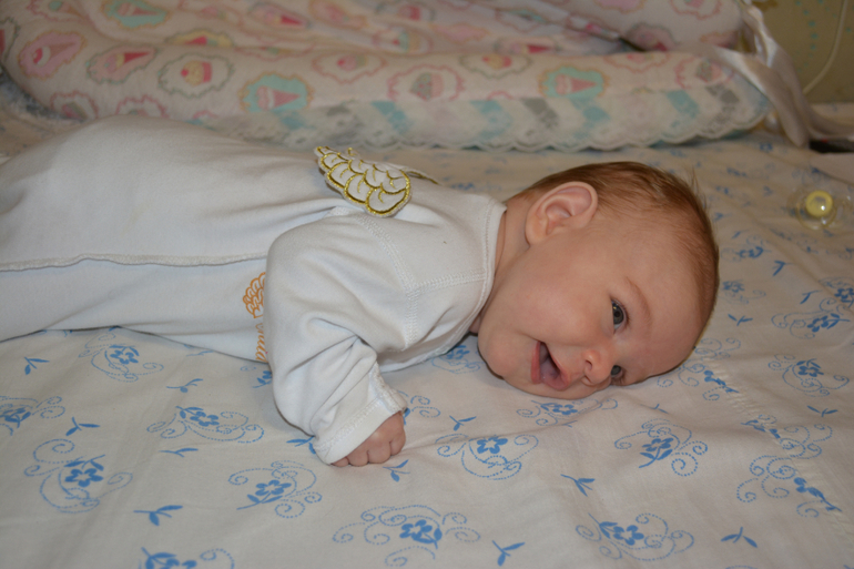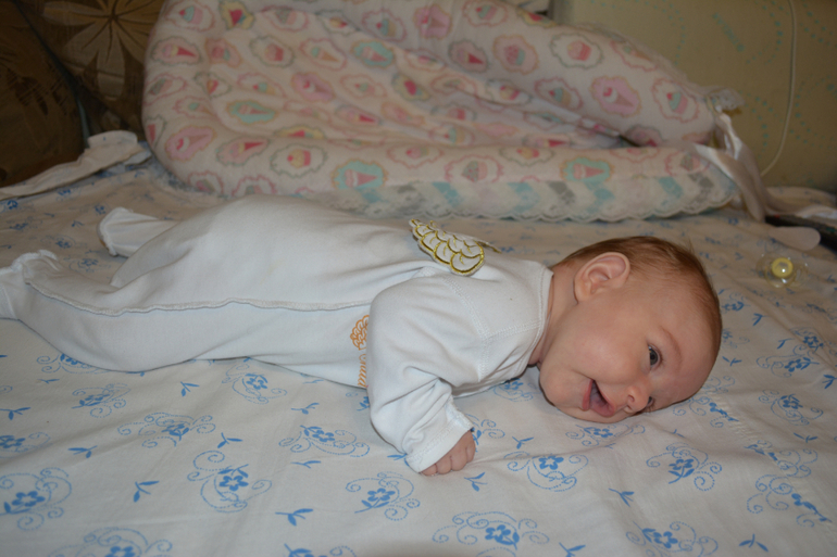 Хорошо держит голову. На животе не очень любит тусить, но на ручках уже держится с упором) Ворочается, но особо не замечала переворотов. Так, перекатывается)