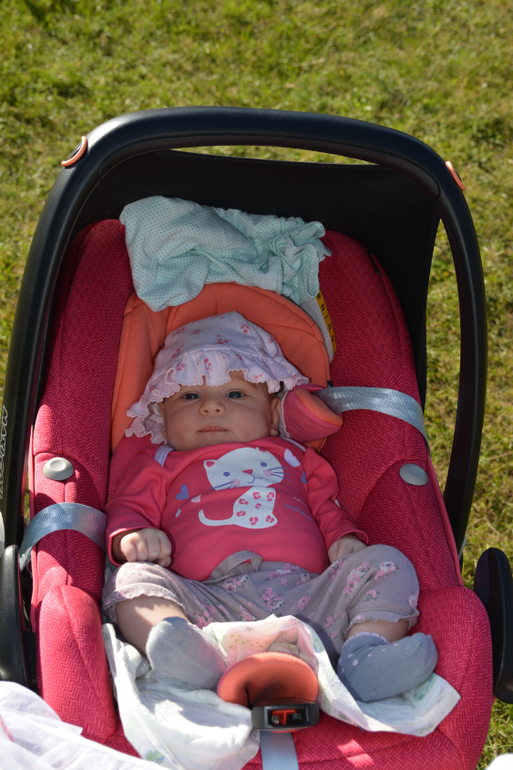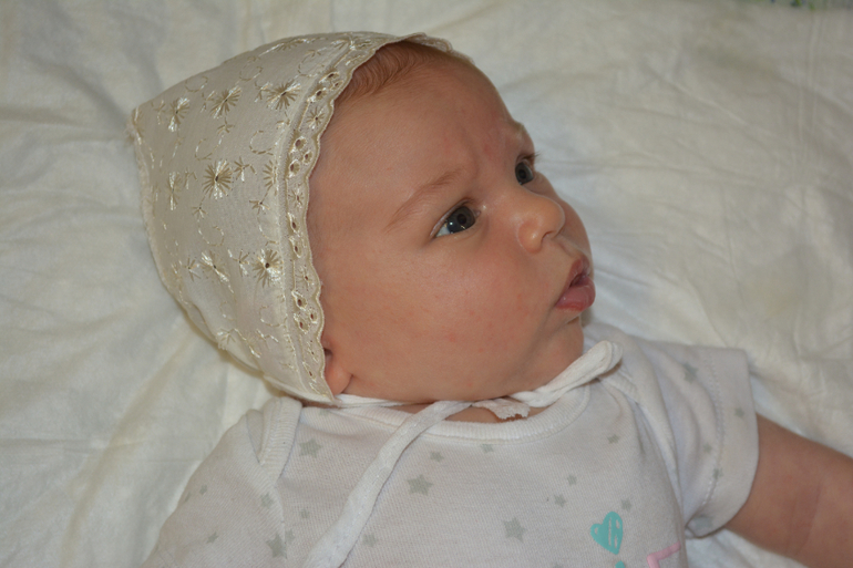 Соску берет, но большей частью чтоб уснуть и то не всегда. в период бодрствования может минутку потеребить и все) Держит погремушку, может вытащить соску сама) Спит пока без режима, я не парюсь. После трех буду подгонять один сон под Кристин, хотя сейчас частенько так и выходит. Глазки всё такие же очаровательно серые, волосики русые) светленькие)