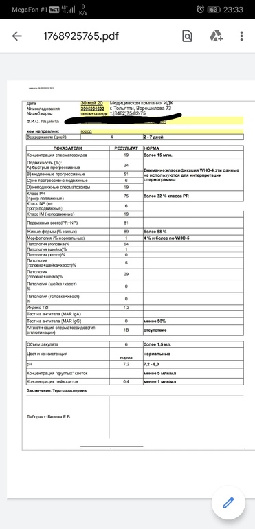 Здравствуйте, девчонки! ПОМОГИТЕ разобраться, морфология 1%?😥Тератоозоспермия? 😔У кого так было и кто как лечил?