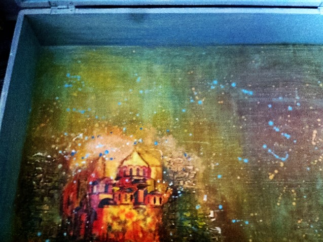 Поэтому лично мне очень хотелось, чтобы подруга верила в то, что ее мечта осуществима в будущем. Поэтому я решила визуализировать ее мечту. Я попросила свою подругу-художницу сделать деревянный сундучок с сюжетами из прошлого на крышке, а внутри я попросила ее нарисовать этот Храм ВОССТАНОВЛЕННЫМ. Она бесконечно рассматривала фото разрушенного Храма и…не могла представить его во всей красоте и величии. Говорит: "Ир, нарисуй ты его, а я перенесу в сундук." А я бы с удовольствием, но не умею я так рисовать. Образ в голове живет, а руки не могут отразить на бумаге этой красоты. Промучалась я так с рисованием несколько дней-ночей и когда уже готова была сдаться и отказаться от этой идеи, мне в руки просто прыгает из шкафа книга отца Дамаскина, а на ее обложке красуется ОН, Храм, живой, красивый, радостный.