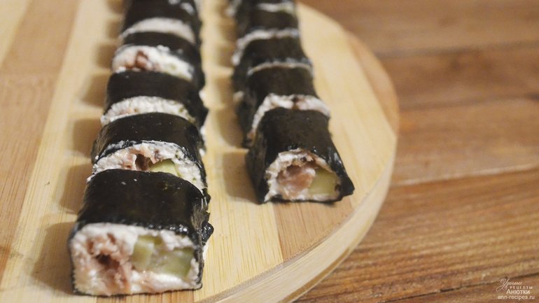 Выложить на нори тонкий слой творога так, чтобы с одной стороны остался сантиметрик. Сверху выложить начинку, на ближний к вам край листа. С помощью циновки сверните ролл. Намочите край нори, чтобы ролл хорошо скрепился. И всё, готово - наслаждайтесь)