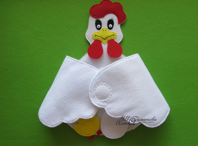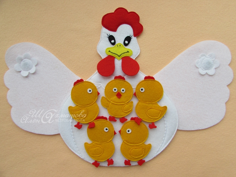 Сшила еще одну маму-курочку. В этот раз решила сделать крылышки из мягкого фетра, чтоб в процессе игры не оставалось заломов. Идея игры принадлежит Наталье Мелковой.