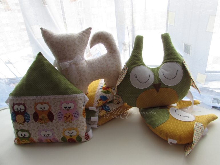 По мастер-классу от Марии ("Расчудесье" на ЯМ) сшилась у меня вот такая гирлянда для детской кроватки или комнаты с парочкой совят, звездочками и месяцем!