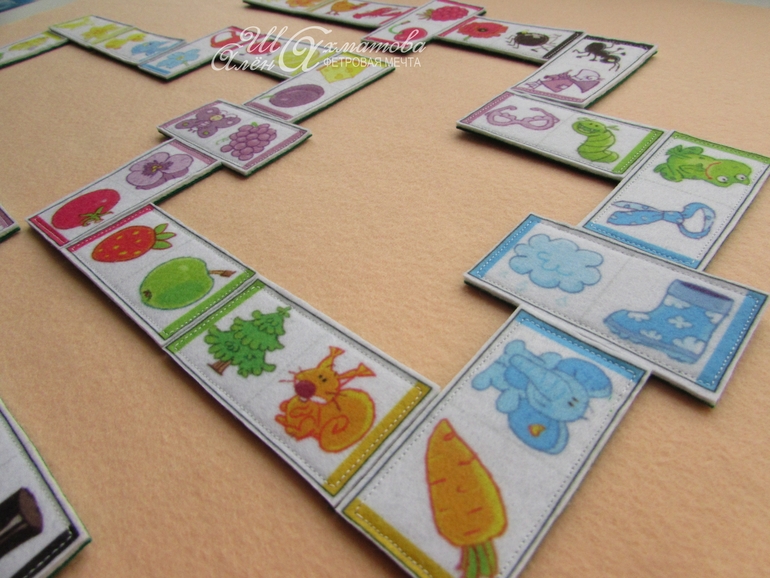 Сотворилось у меня вот такое домино)) 27 карточек размером 3,5 х 6,5 см с изображениями различных предметов и животных. Карточки плотные, состоят из 3х слоев жесткого фетра. Яркие картинки, цвет дублируется полоской сбоку.