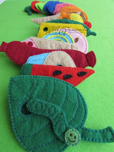 Сшила еще одну игру-шнуровку по мотивам замечательной книги Эрика Карла "Очень голодная гусеница". В этот раз это не просто шнуровка) В каждый предмет вшит неодимовый магнитик. Теперь можно шнуровать предметы и крепить игрушки на магнитную доску или холодильник. Все подробности описывала тут. Сшито вручную.