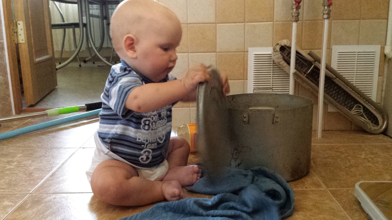 Очень любит играть со шваброй, метелкой, камтрюлями....игрушки так его не занимают, как хоз вещи. Очень любит открывать двери и ящики, вытаскивать все из пакетов и перебирать... любит ходить и очень быстро ползает на четвереньках. Может несколько секкнд постоять без опоры...очень хочет оторваться от дивана и пойти..но пока опасается. Любит эргорюкзак и с удовольствием так путешествует. Очень понравилось ему купаться на речке....полный восторг..плавает в круге в бассейне во дворе. В ванной любит играть со струей воды. Вот такое замечательное чудо. Ну и фото)