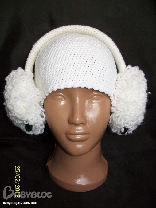 На шапочке кнопка,шапочку можно носить без наушников,цветочек хочу ещё один связать,этот не очень нравится