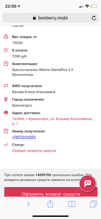 Типа вылезла ошибка оплаты. Деньги списали . Вылезло окно «возврат», ввела данные и приходит запрос на пароль на ещё одно списание , уже в Тиньков (первое было как положено, от Боксбери)!