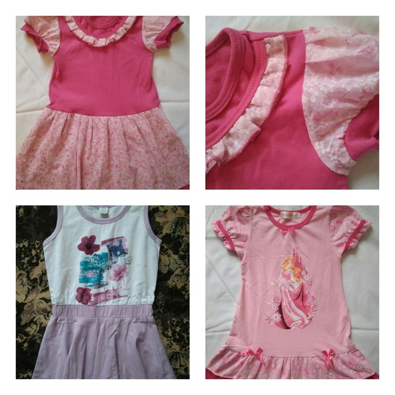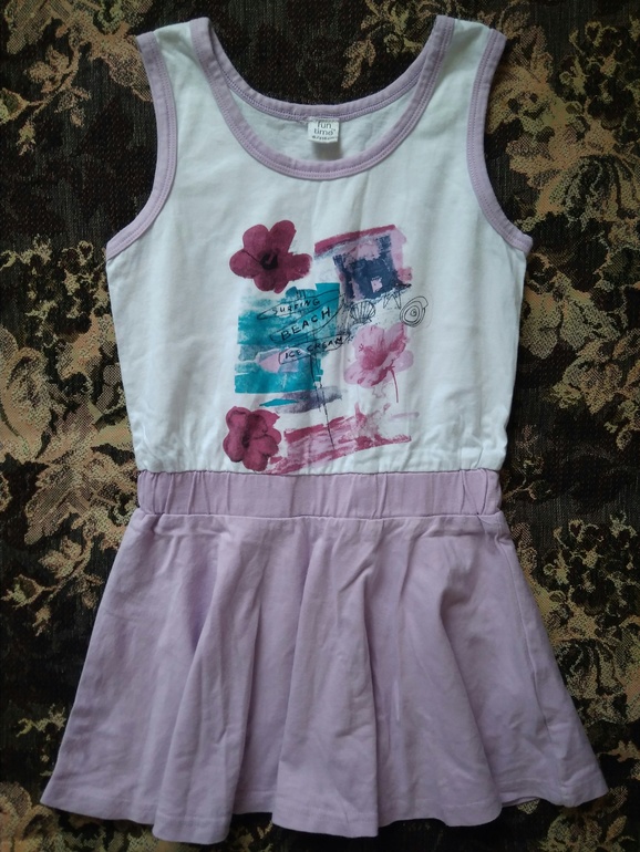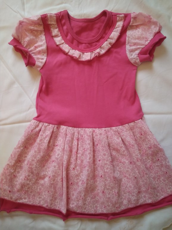 1. Симпатичное трикотажное платьице, тянется, малиновое с розовым, на рост наверное 110. Длина 57-58 см. Юбочка двойная. Хлопок.
