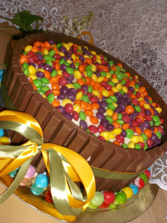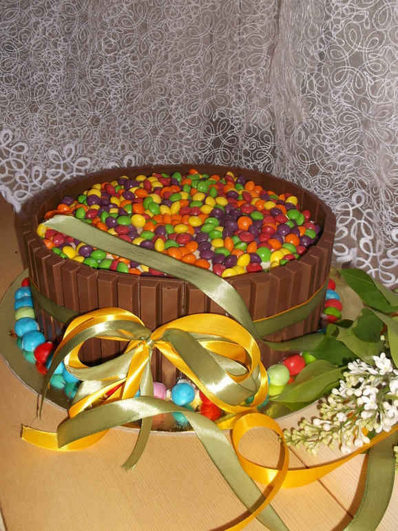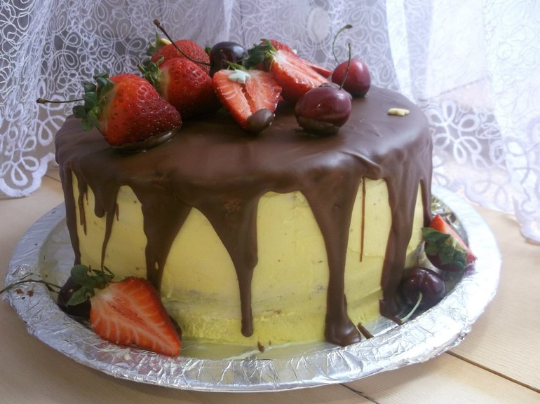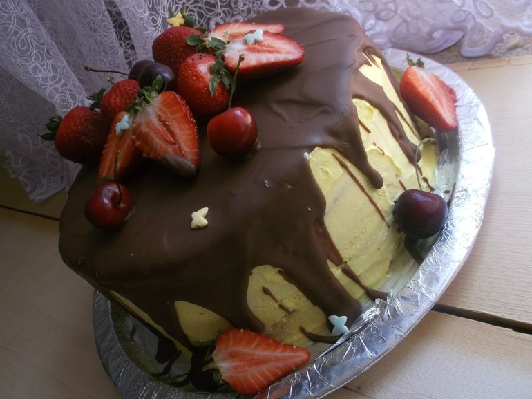 шоколадные коржи и крем сливочный, сверху шоколадная глазурь