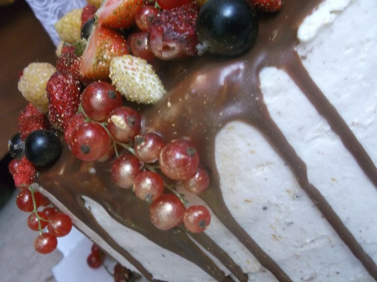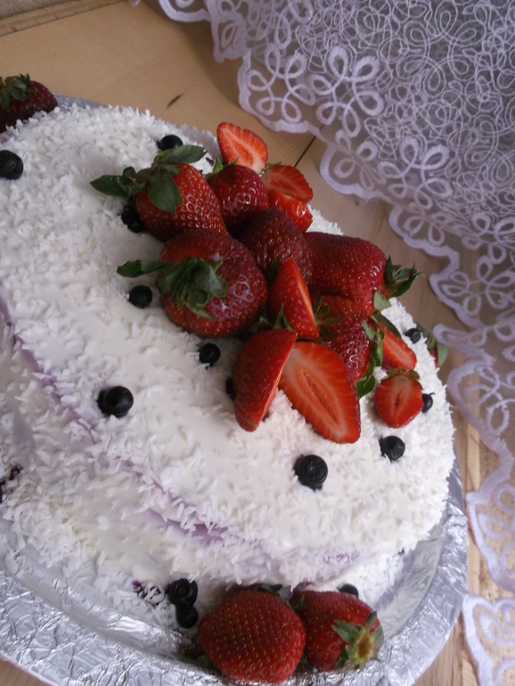 Торт, бисквит с кремом на основе творожного сыра и с кусочками клубники