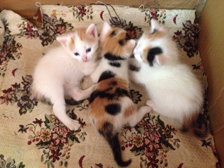 3 девочки 3 х цветного окраса, приносящие счастья в дом, ищут себе семья!! Так же их молодая мамочка ( возраст около года) ищет себе заботливые ручки! Кошка очень ласковая, приучена к лотку, обработана от паразитов , прививку не успели поставить из-за котят