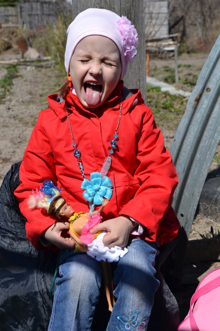 Катюшка дурачится, родители подарили ей бусы, которые она незамедлительно на себя одела.