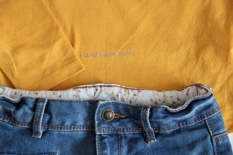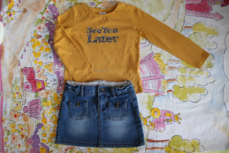 23. Лонг горчичного цвета и джинсовая юбка фирма Tape à l'œil, размер 110, в идеальном состоянии, комплект 850 руб.