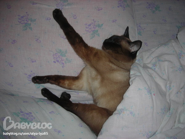 Его звали Сэм, прожил с нами 15 лет, такого умного и преданного животного никогда не видела, но как и все сиамские кошки любил он сильно и ненавидел так же.)))) Ненавидел он моего брата, ненавидел за то что тот его обежал и за это мстил ему, кусался наш Сэм ужасно, даже не кусал, а вгрызался в тело и рвал, даже не знаю почему мама его никому не отдала, т.к. в травмпунктах мы частенько бывали, если бы какой-нить котик даже пускай и свой домашний укусил Никитку, он бы полетел на улицу в три счета...Так вот в детстве ненавидела брата и я и если мы с братом дрались, а я говорила фас, то Сэмик бросался на мою защиту и нападал на Дениса. Ну и конечно бедному котику пришлось "поиграть" в куклу, здесь главное было хорошенько его запеленать, завязать ленточками и уложить спать в колячку, "поиграть" в больного, у меня был детский докторский набор и мы с братом очень любили полечить его, но несмотря на это он очень меня любил, лет с 20-ти я стала бывать дома наездами, иногда дома у родителей не была по нескольку месяцев, но Сэм всегда меня сразу вспоминал и звал спать, он вообще толком не мог спать без людей, обычно спал или со мной или с папой, а точнее на наших шеях или рядышком под одеялом, притом голова нежилась на подушке.))) Если я долго не шла, он начинал легонько покусывать мои ноги и стремглав бежать в мою комнату и прыгать на кровать, типа, мать, пошли спать.))) Кстати, так я и поняла, что его не стало...Отмечала свое д.р. на исторической родине у родителей дома, предки были сосланы к бабушкам, мы соответственно наводили шухер в квартире, потом пошли в клуб за продолжением банкета. Прихожу домой в 4-м часу утра, кот меня не встречает, а я повторюсь, что он только днем может спать без сопровождающего лица, меня это сразу смутило, стала его искать, звать, ответа нет, вот не знаю что, повело меня на балкон, дверь на него была как всегда открыта, окно тоже, я прям как почувствовала, выбежала во двор, а там он лежит, упал с 9-го этажа, такой истерики у меня никогда не было и надеюсь никогда не будет...
