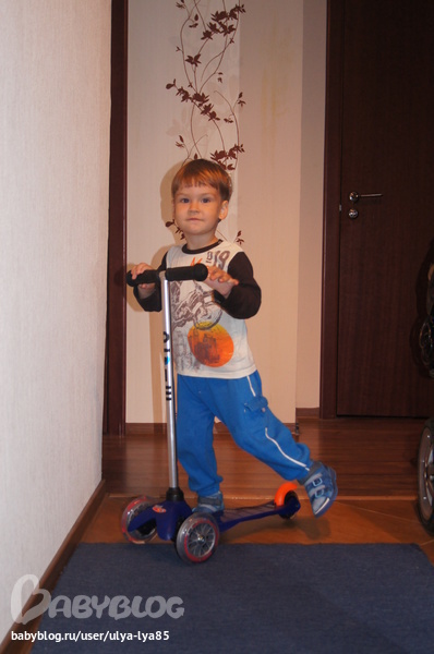 Ему очень нравиться и получается хорошо, вчера наш дедушка видел, он даже сказал, что удивлен как Никита катается, а от него похвалы вообще никогда не дождешься.)) Никита счас 93 см, но он худенький, около 13 кг, поэтому я решила макси не покупать, этот самокат гораздо тяжелее, а мини он сам спокойно таскает, а вам лучше действительно макси купить, Макарка покрупнее, а мини до 20 кг расчитан, у него подножка пластик.