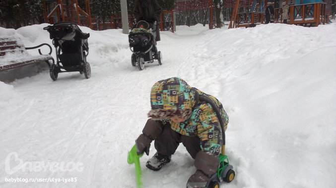 На фото. Никита с лопатой и трактором и наша коляска стоит около скамейки. А чуть подальше едет Никиткина копия.)))
