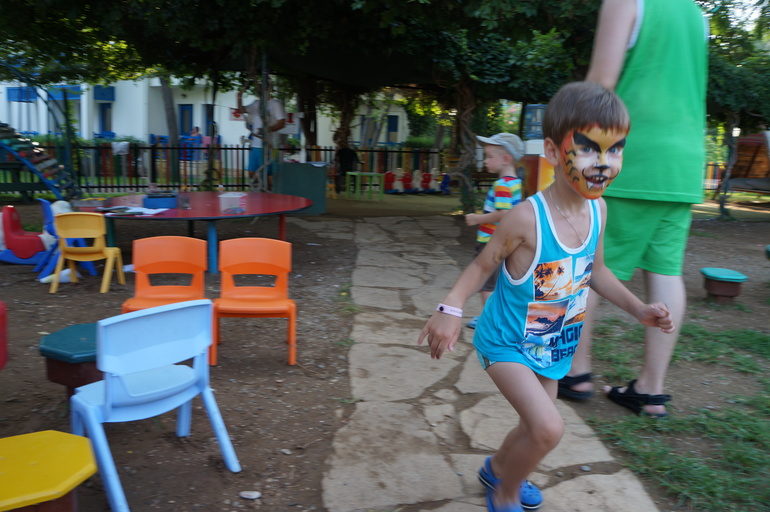 Улучшилась детская анимация. В прошлом году в детском клубе работала русскоговорящая женщина и мужчина-турок, детками вообще не занимались, а только предлагали раскрасить платно футболки. В этом же году было четыре девушки-аниматора, у которых был расписан каждый час для занятий с детками. В этом году мы редко бывали в детском клубе, но застали приготовление настоящей пиццы, детки сами ее делали, потом отнесли на кухню выпекаться, а потом и съели.)) Никита поучаствовал в веселых стартах, а еще его разрисовали аквагримом под тигра, вот это было настоящее счастье у ребенка, до ужина возле каждого окна\зеркала останавливался, рычал, строил страшные мордашки и т.д.)
