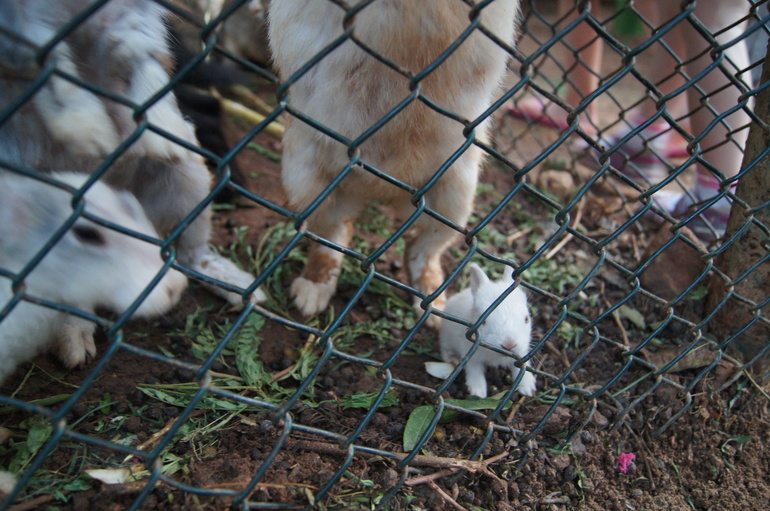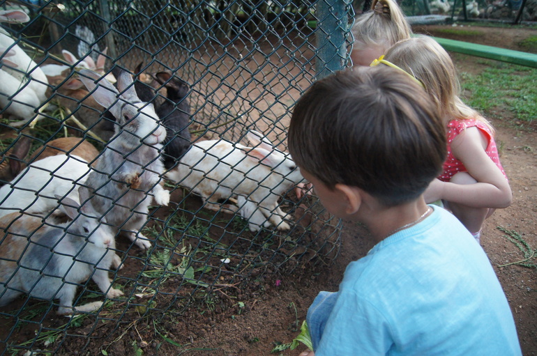 В этом году развелось огромное количество кроликов, в прошлом году их было с десяток, а в этом году новые крольчата появлялись прям на глазах. Никита мог пропадать у этого минизоопарка часами, кормил, кормил, кормил, болтал с ними, а рядом была клетка с птицами, птицы чем-то не угодили детке и он кормить их отказывался.)))![]()