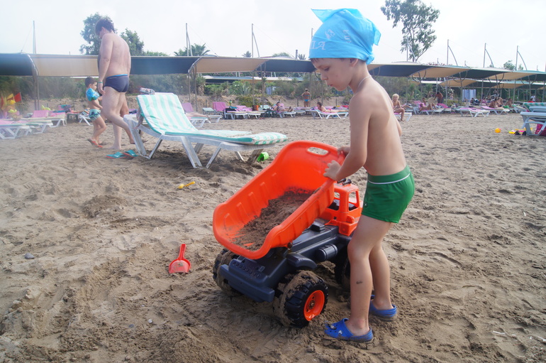 Детская площадка в самом отеле такая же никакущая, но заменили железные горки на пластиковые, видно кто-то нажаловался на то, что дети съезжая с горок, сильно обжигались. Детская площадка на пляже постоянно пустовала, в этом году игрушек там было мало, но отель закупил несколько игрушечных огромных самосвалов, детям в кайф, подкатывают эти самосвалы к морю, грузят песок, воду, выгружают, строят замки.